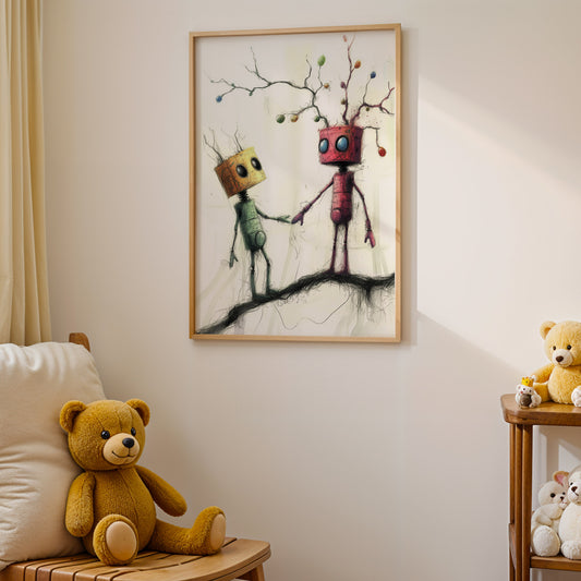 The Bonding Robotics Collection explores the themes of connection, cooperation, and growth through a series of robots reaching out to one another. Some are holding hands, while others are stretching out, eager to connect. Set against a simple white background, the robots are perched on branches with plants growing from their bodies, symbolizing the fusion of technology and nature. This collection encourages children to think about relationships and the potential for growth in unexpected places, challenging their imagination to consider how the mechanical and natural worlds can work in harmony. It sparks curiosity by inviting children to imagine how robots might develop emotions and interact with their environment.