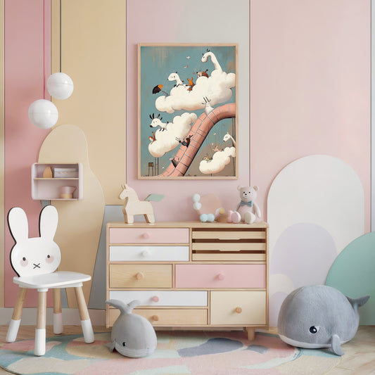 With soft pastel tones and a dreamlike atmosphere, this kids’ imaginative wall art is the perfect mix of calm and curiosity, turning every glance into an invitation to dream.