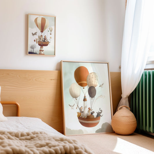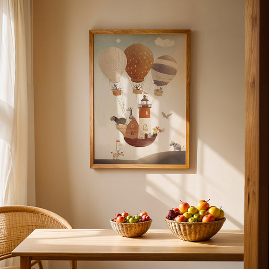 Ever wondered what happens when animals take to the skies? Welcome to Tower of Dreams, where imagination floats as high as a hot air balloon. This collection brings together the whimsy of wildlife, the mystery of a lighthouse in the clouds, and the adventure of skybound travel. It's a story about curiosity—what’s out there beyond the horizon?—and a celebration of teamwork. These art pieces encourage children to dream big, explore unseen worlds, and wonder how their favorite animal buddies would pilot the skies. Perfect for sparking creative daydreams and igniting endless “what if” questions, this collection turns walls into windows to adventure.