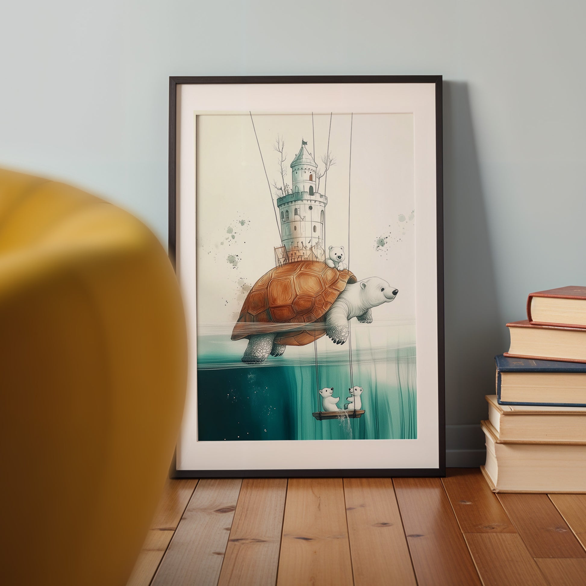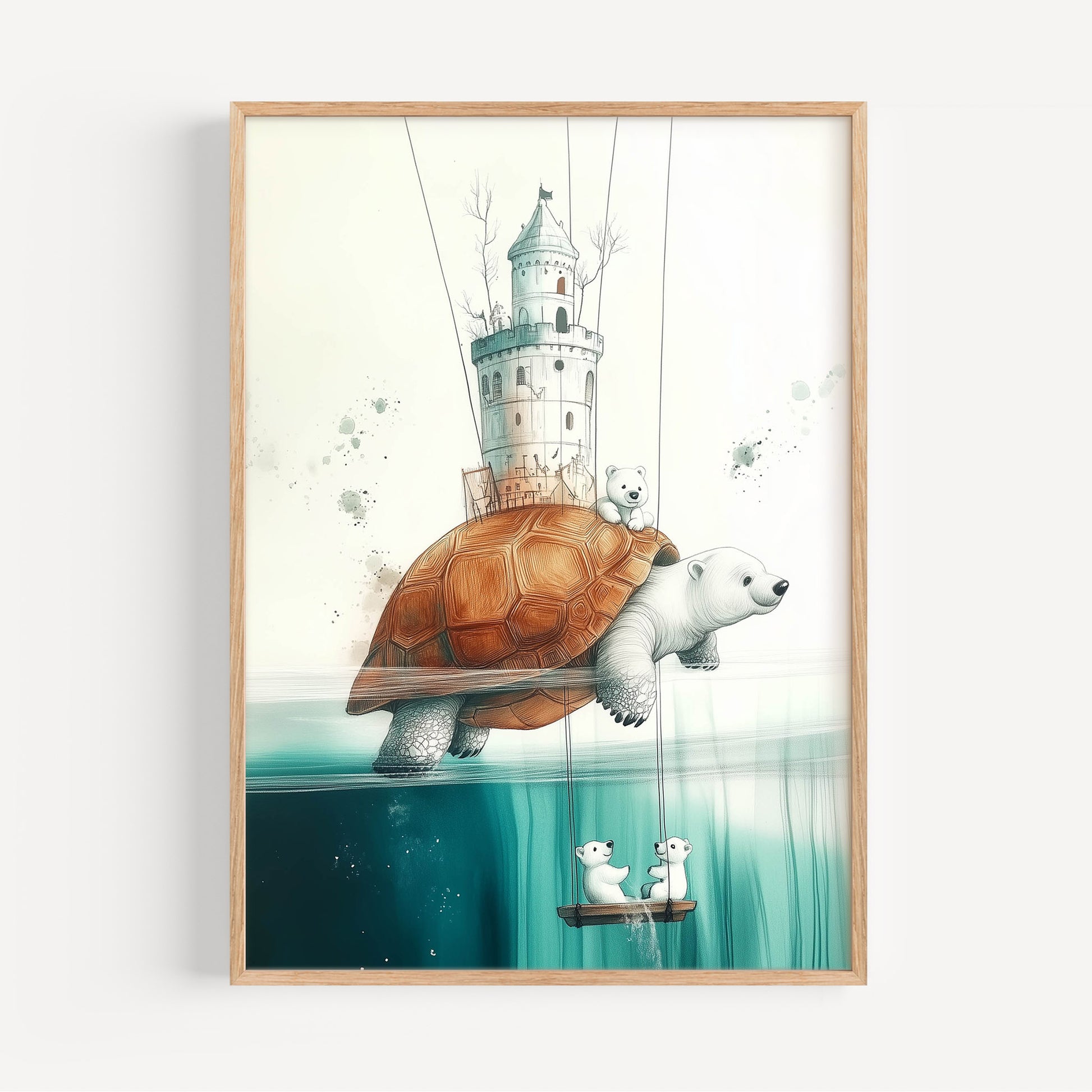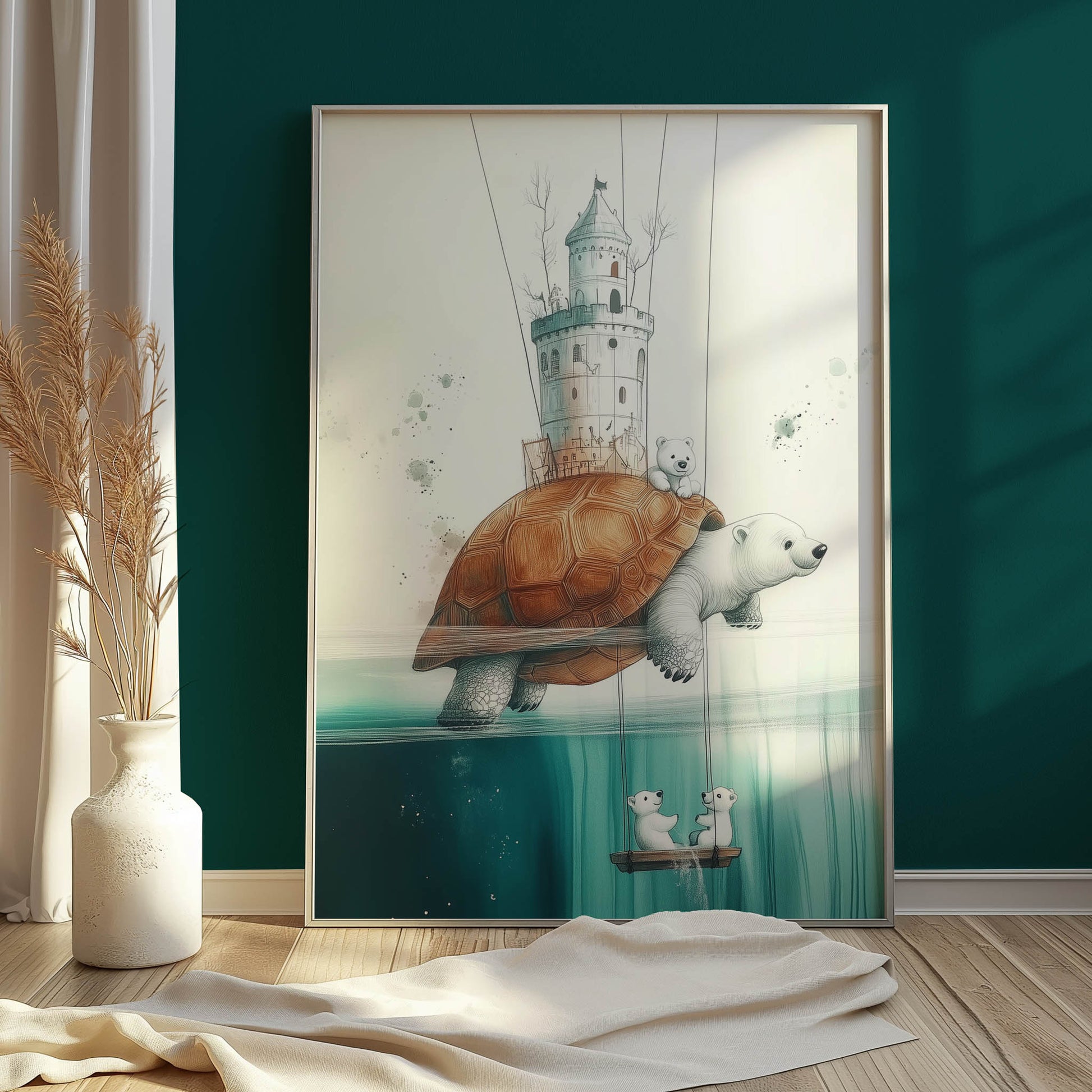 This piece from Arctic Adventureland brings the magic of polar bear turtles and castles to life. Imagine an arctic kingdom carried on the back of a turtle bear, with bear cubs swinging through frosty skies. Designed to inspire creativity and curiosity, it’s perfect for kids who dream of extraordinary adventures.
