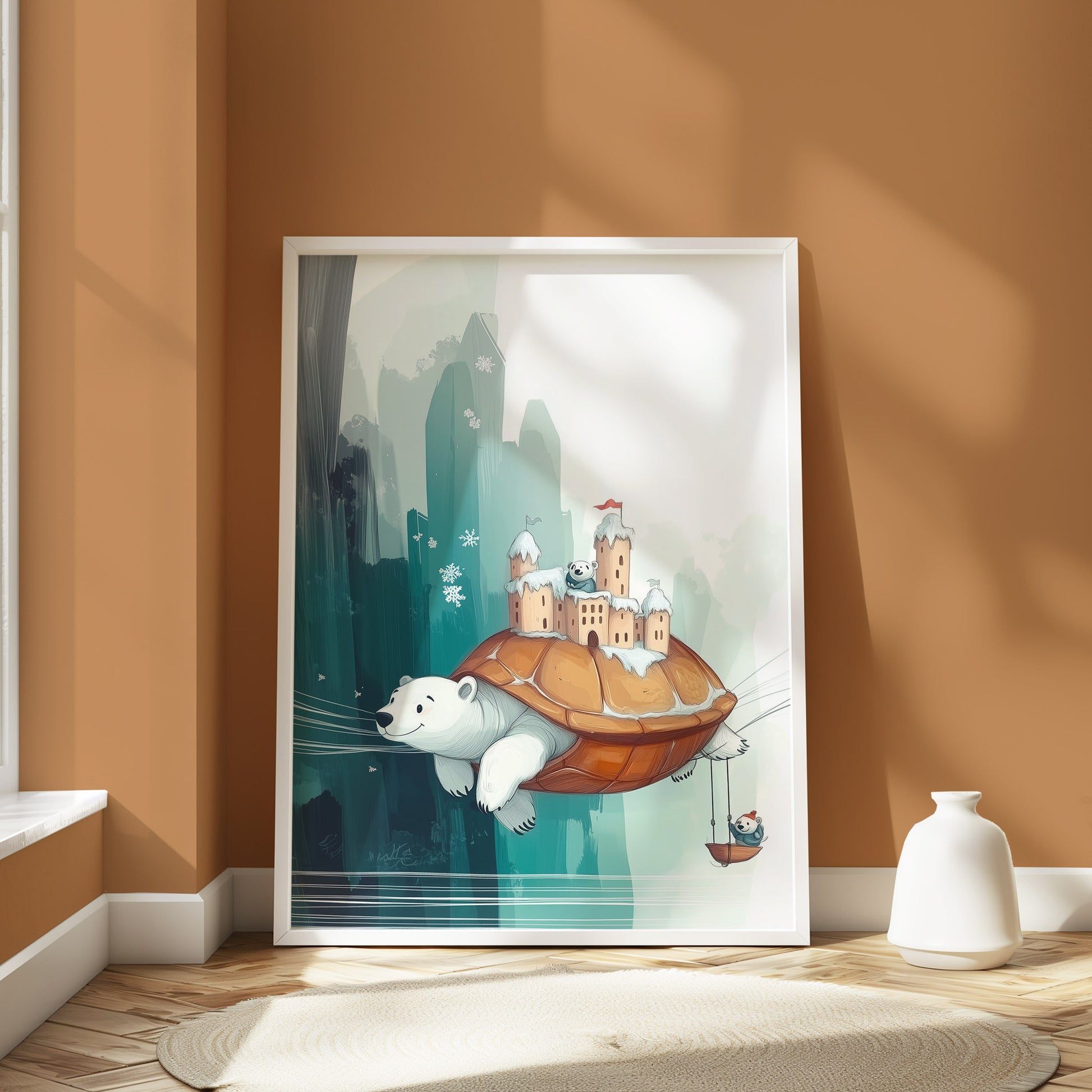 This piece from Arctic Adventureland brings the magic of polar bear turtles and castles to life. Imagine an arctic kingdom carried on the back of a turtle bear, with bear cubs swinging through frosty skies. Designed to inspire creativity and curiosity, it’s perfect for kids who dream of extraordinary adventures.