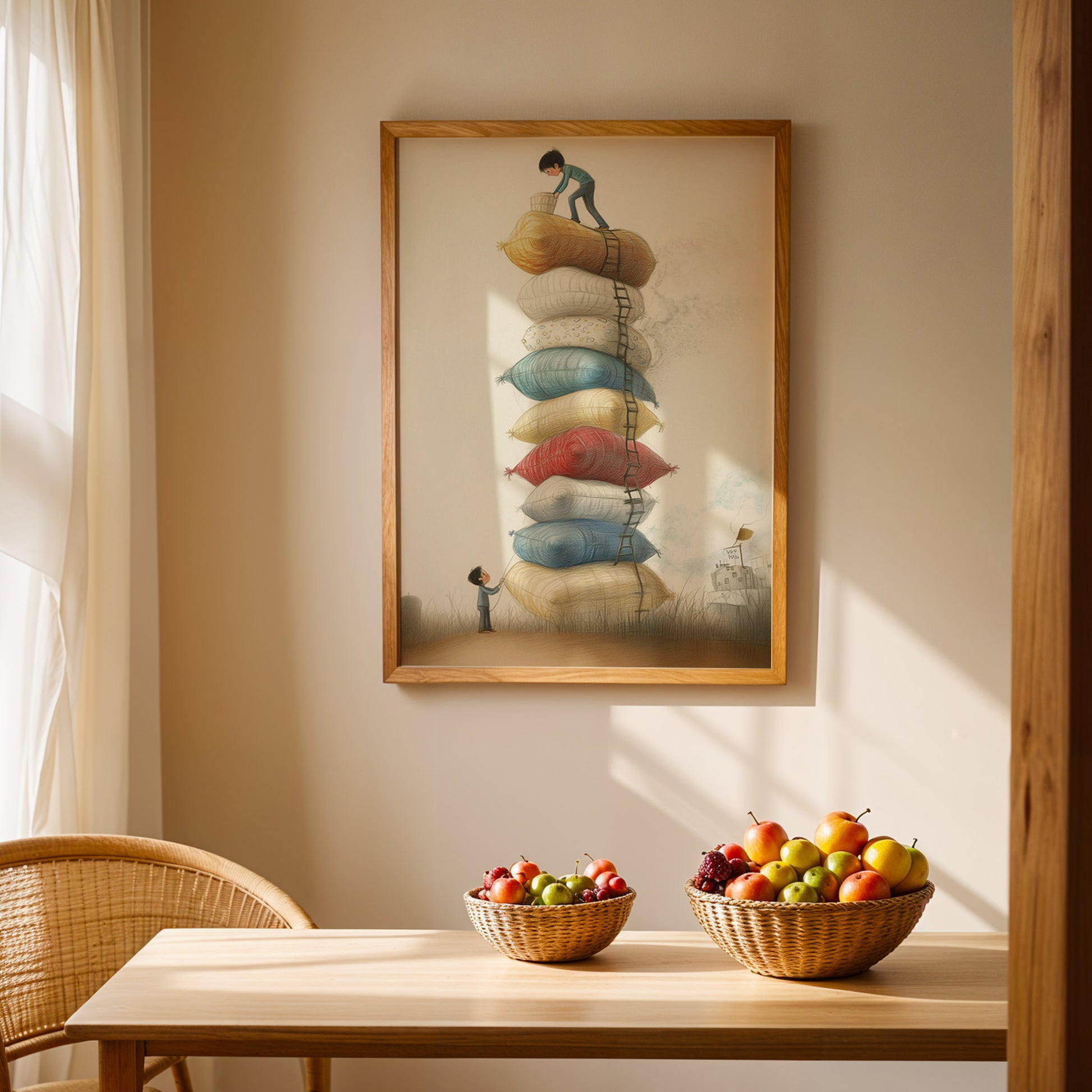 From the Balancing Dreams Collection, this piece celebrates the magic of turning simple ideas into grand adventures. Inspired by pillow towers reaching sky-high, it encourages kids to explore teamwork, creativity, and the courage to aim for the impossible. Let this inspiring art piece bring playful energy to your child’s room!