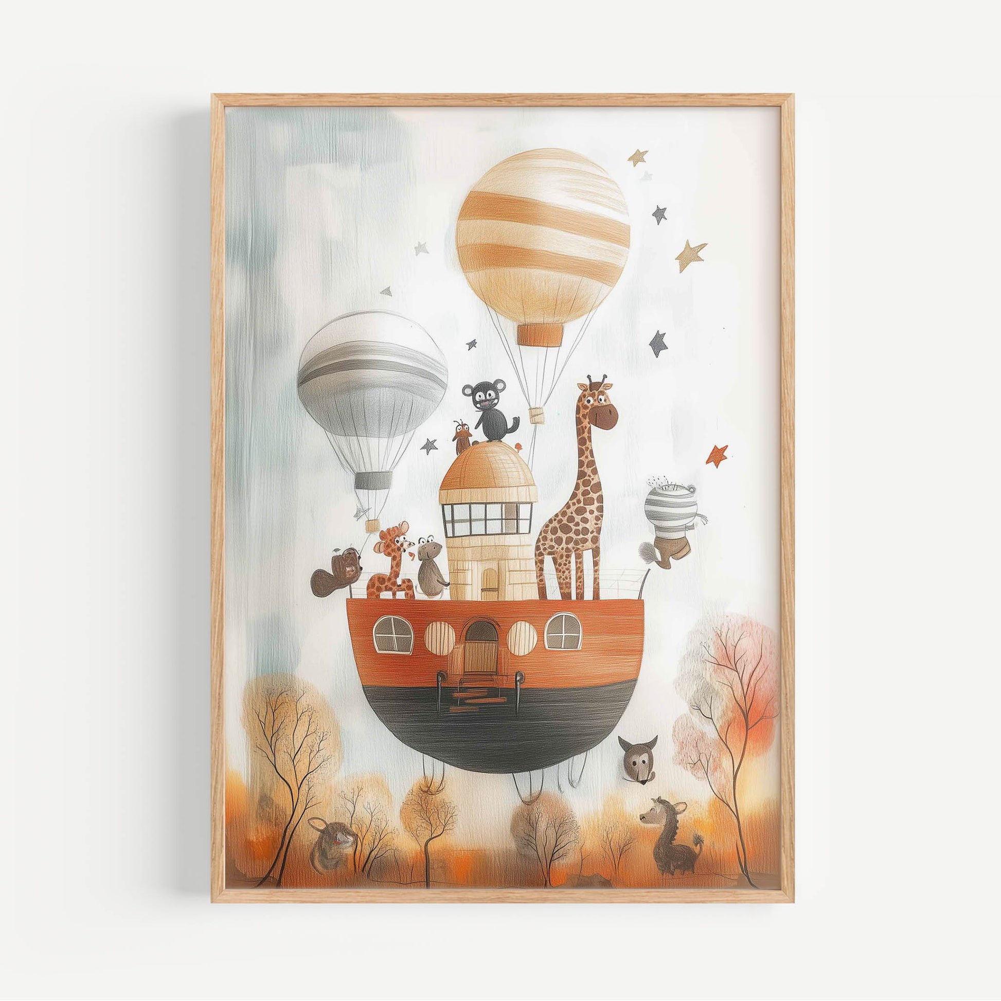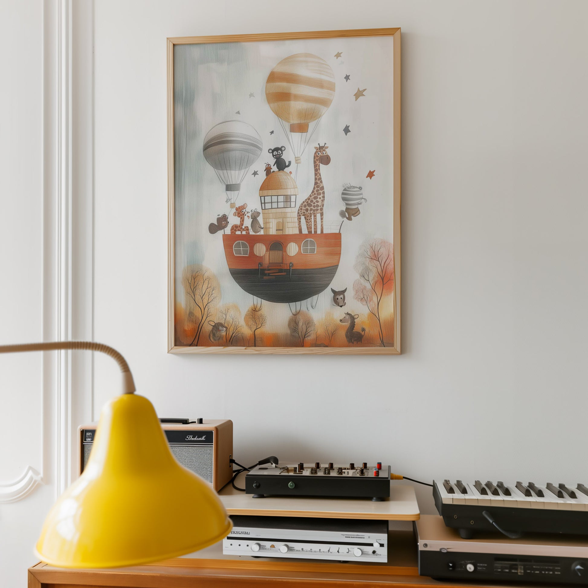 From the Cosmic Safari Collection, this whimsical piece takes Earth’s most majestic creatures on an interstellar adventure. With an ark soaring through space, it captures the spirit of exploration and curiosity that inspires young imaginations. A playful mix of safari vibes and galactic wonder, this print transforms walls into storytelling canvases.