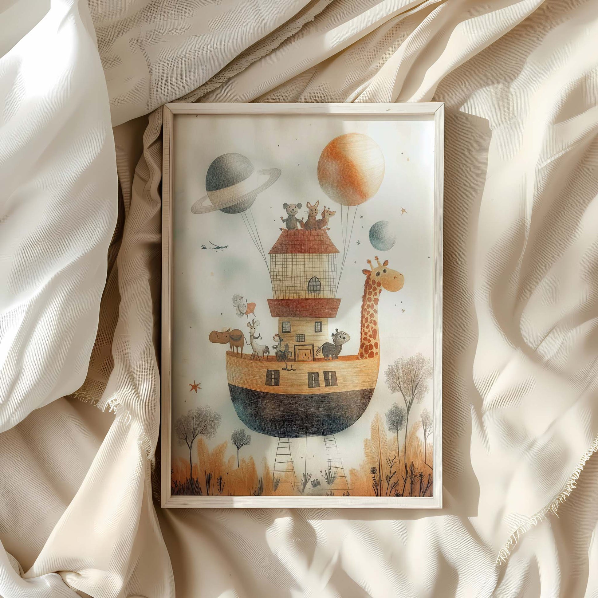 From the Cosmic Safari Collection, this whimsical piece takes Earth’s most majestic creatures on an interstellar adventure. With an ark soaring through space, it captures the spirit of exploration and curiosity that inspires young imaginations. A playful mix of safari vibes and galactic wonder, this print transforms walls into storytelling canvases.
