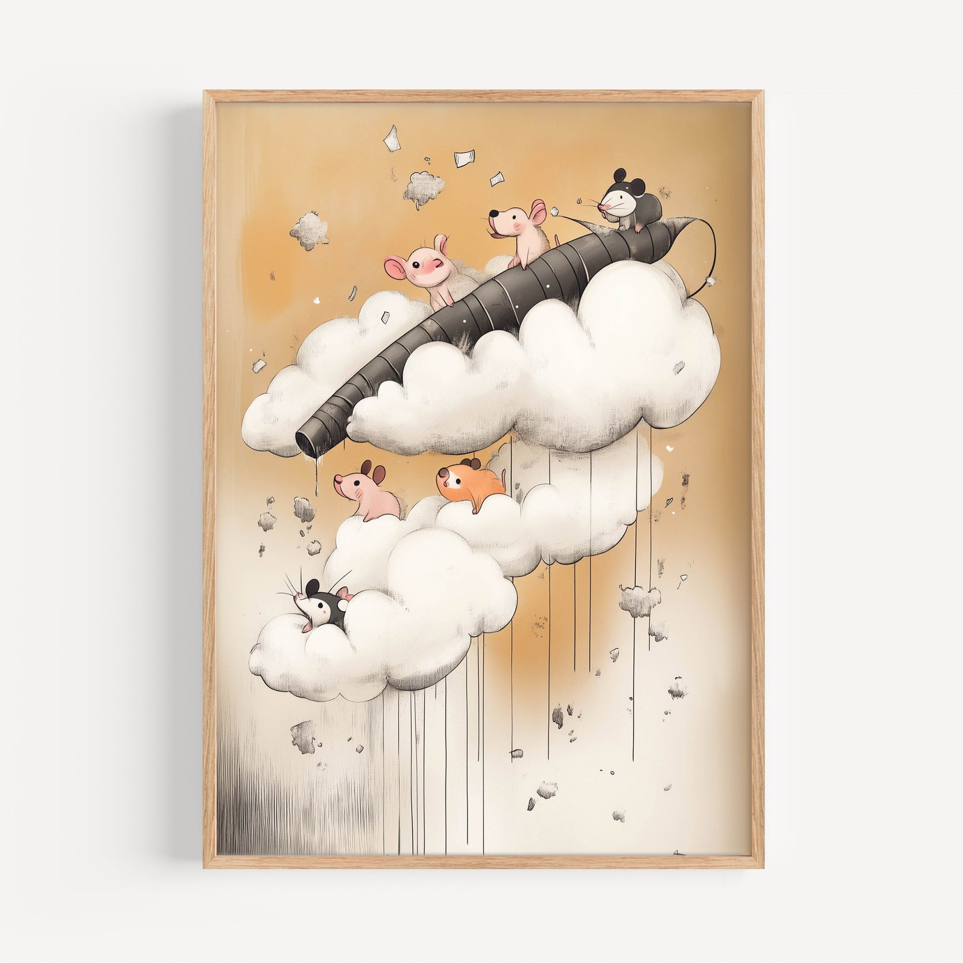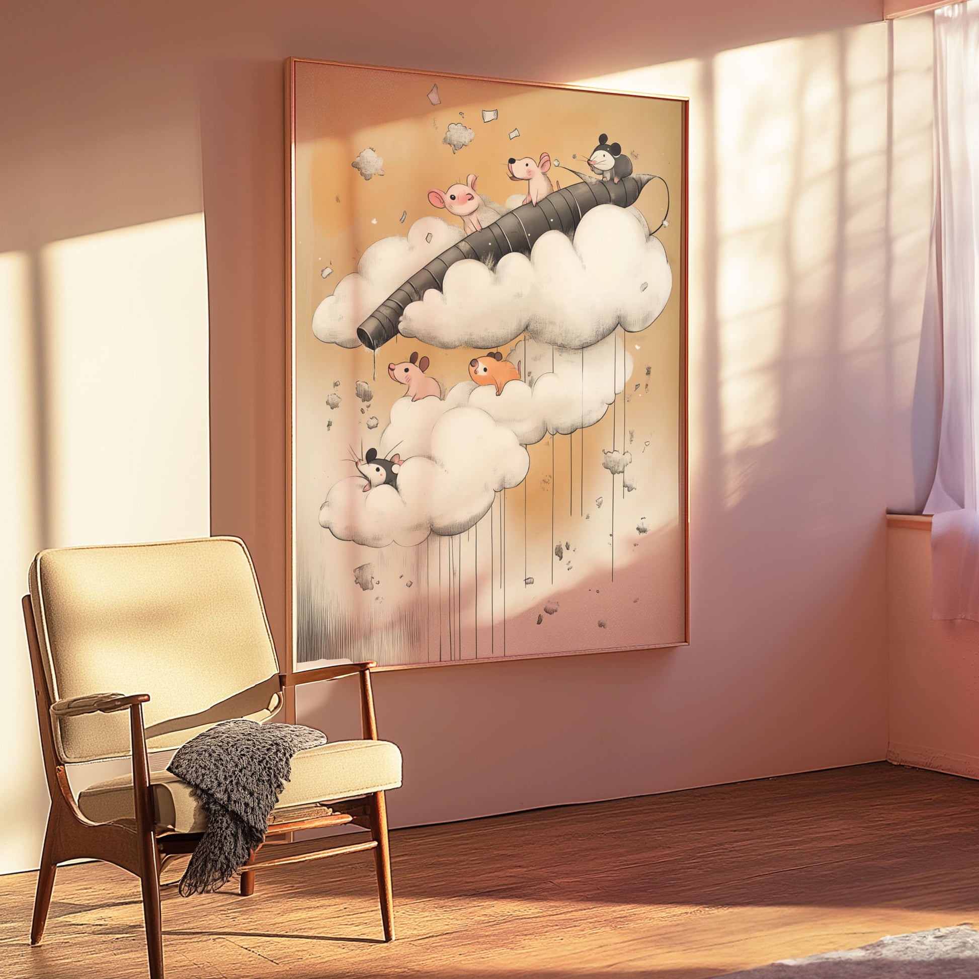 This piece from the "Fluff Factory Collection" shows animal creatures hard at work—constructing clouds, one puff at a time. Ladders? Check. Weirdly adorable tools? Also check. It’s a playful twist on how the sky gets its fluff, perfect for sparking your kid’s imagination and adding some next-level charm to their room.