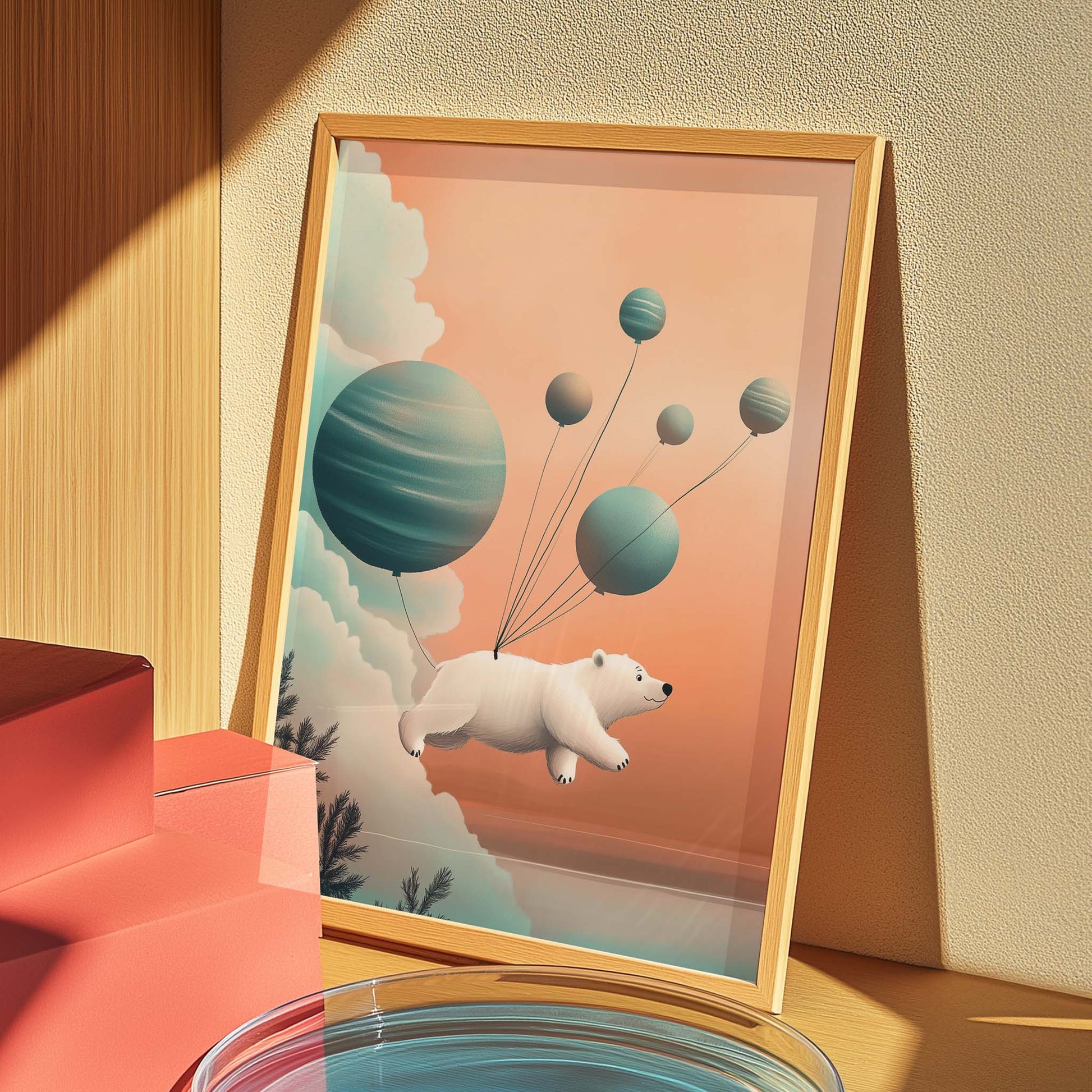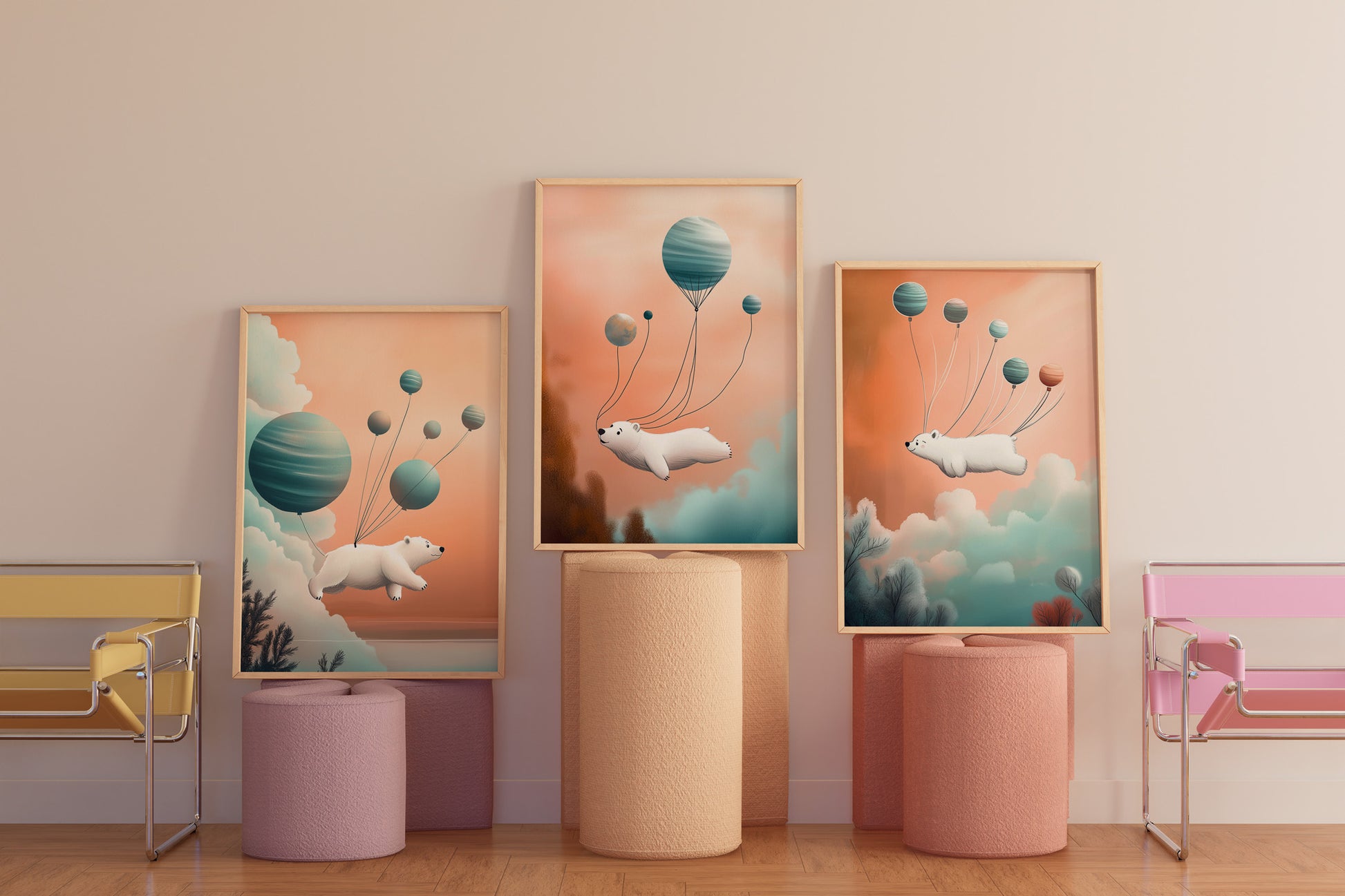 This print from the Polar Voyage Collection captures a polar bear soaring gracefully through pastel skies, tethered to planet-like balloons. It’s a story of exploration and dreaming big—perfect for igniting creativity in young hearts. Bring home this enchanting escape and let your child’s imagination take flight every day.