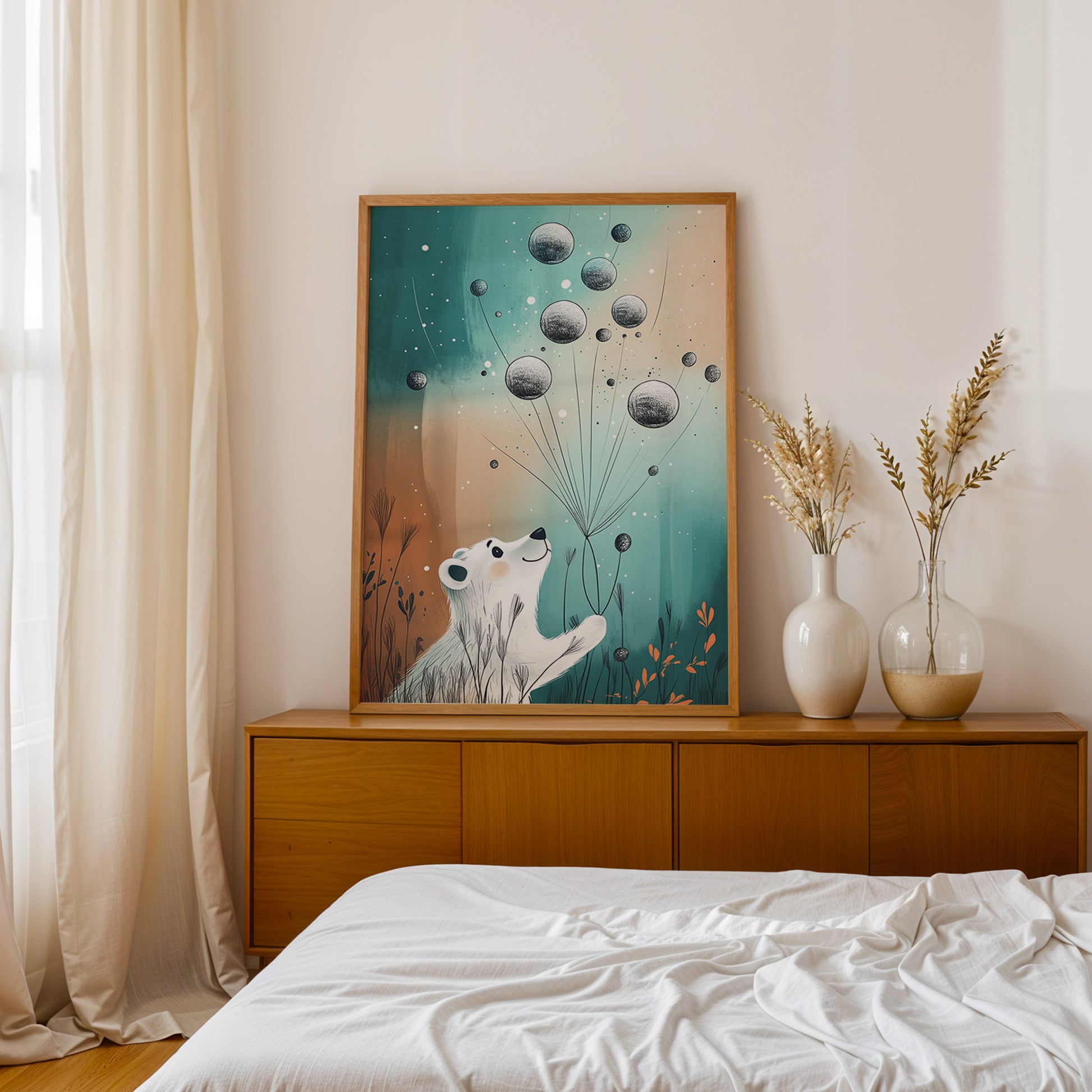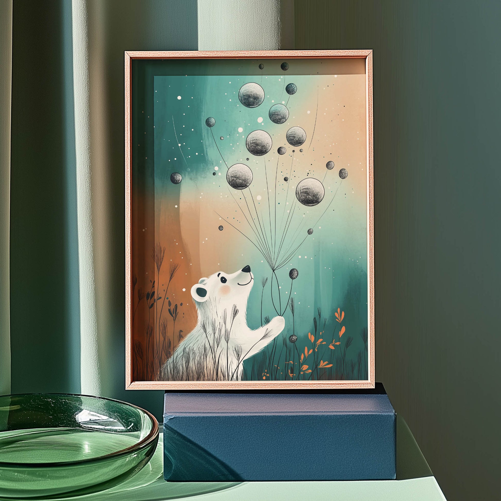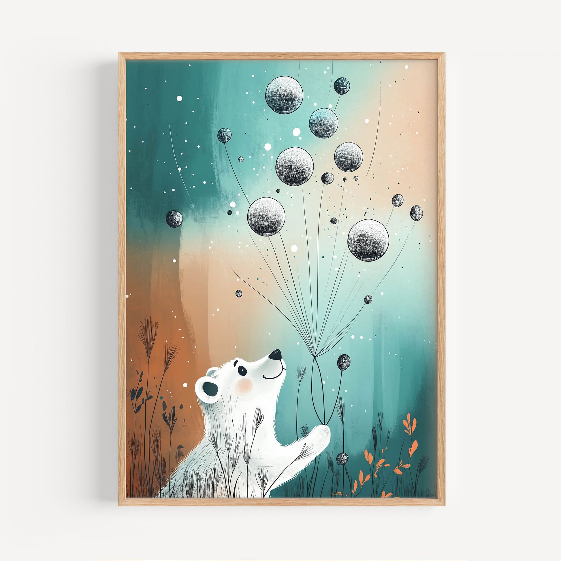 This print from the Polar Voyage Collection captures a polar bear soaring gracefully through pastel skies, tethered to planet-like balloons. It’s a story of exploration and dreaming big—perfect for igniting creativity in young hearts. Bring home this enchanting escape and let your child’s imagination take flight every day.