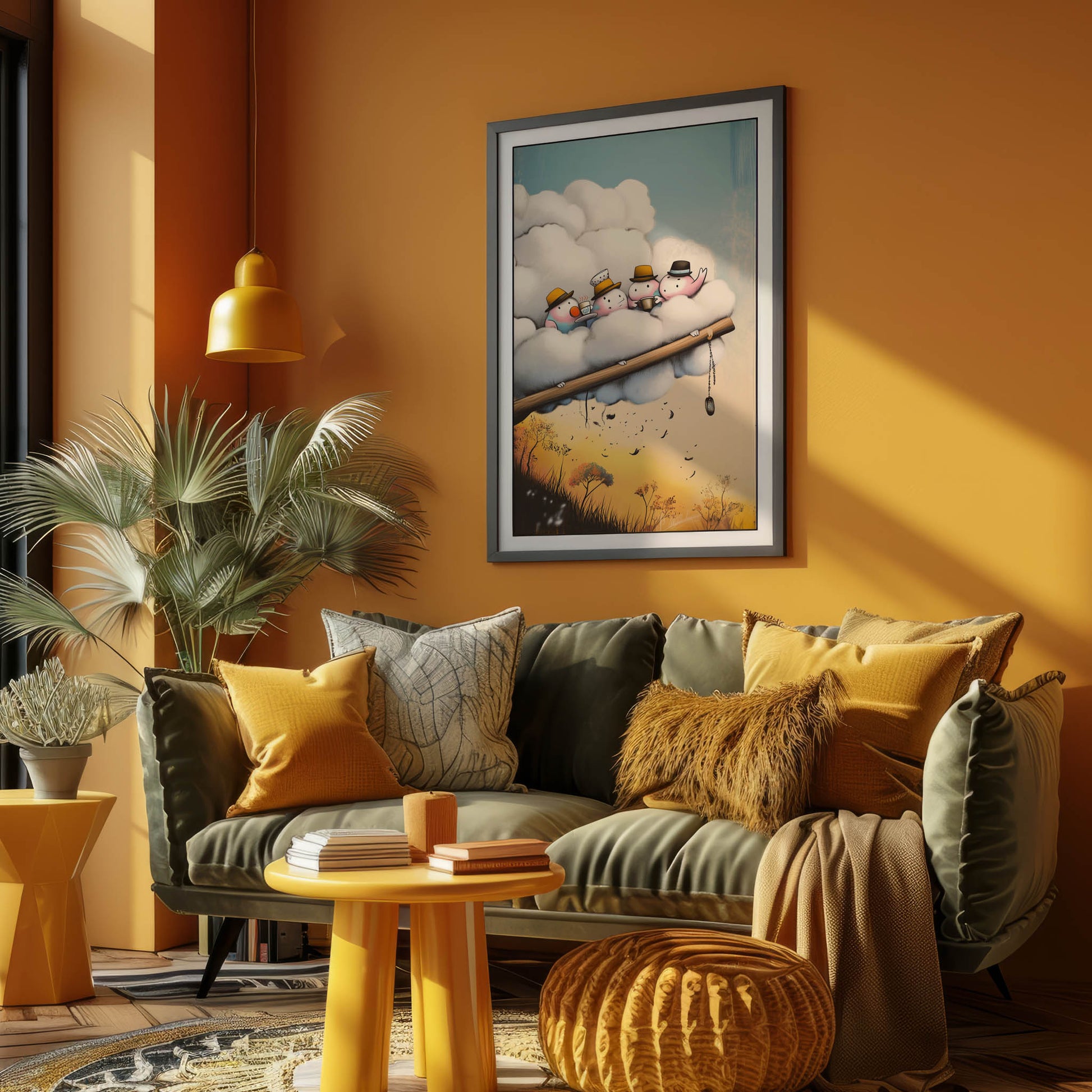 The The Beaked Brothers Collection features colorful, bird-themed wall art that’s as imaginative as it is eye-catching. Each piece depicts a flock of stylish, business-minded birds perched on clouds or trees, complete with hats, ties, and steaming cups of coffee.