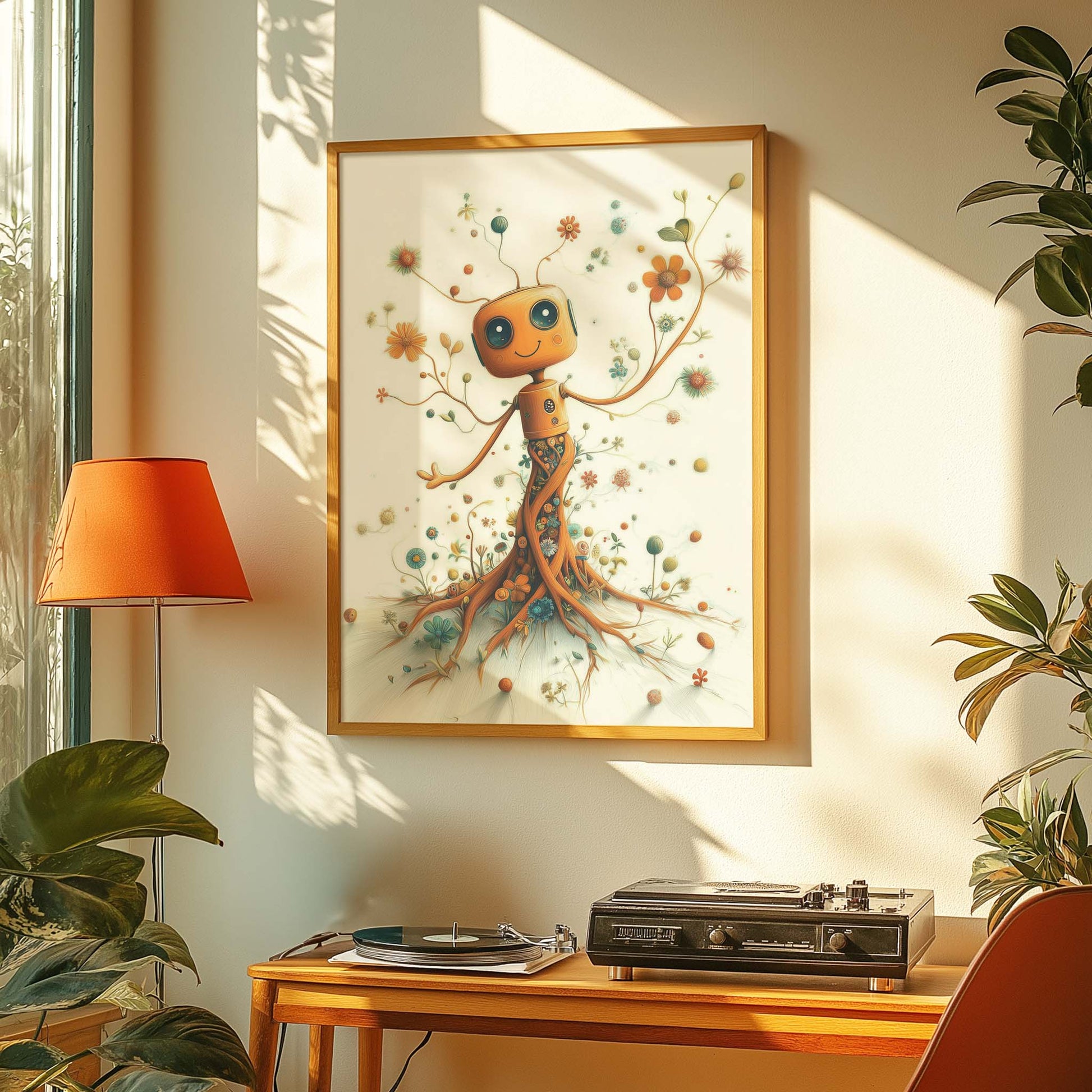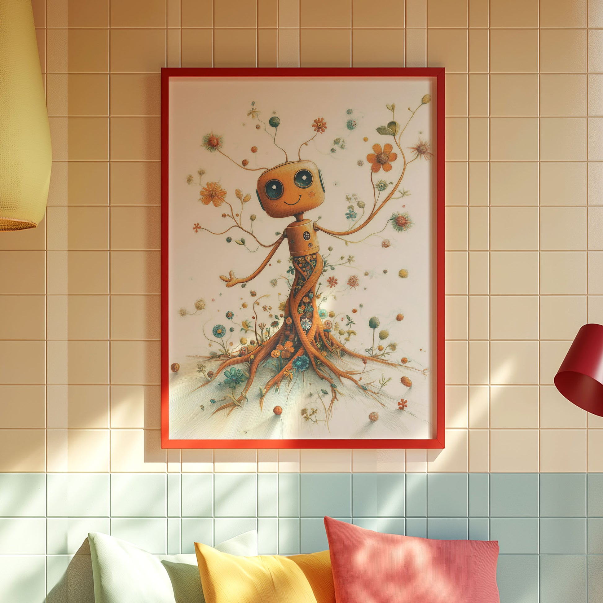 This piece from the Bloom Bot Collection is a celebration of growth and transformation. It’s not just about a robot covered in wildflowers—it’s about the idea that even the most rigid, mechanical things have the potential to bloom and surprise us. This art invites kids to imagine a world where technology and nature don’t clash but complement one another, opening their minds to endless possibilities.